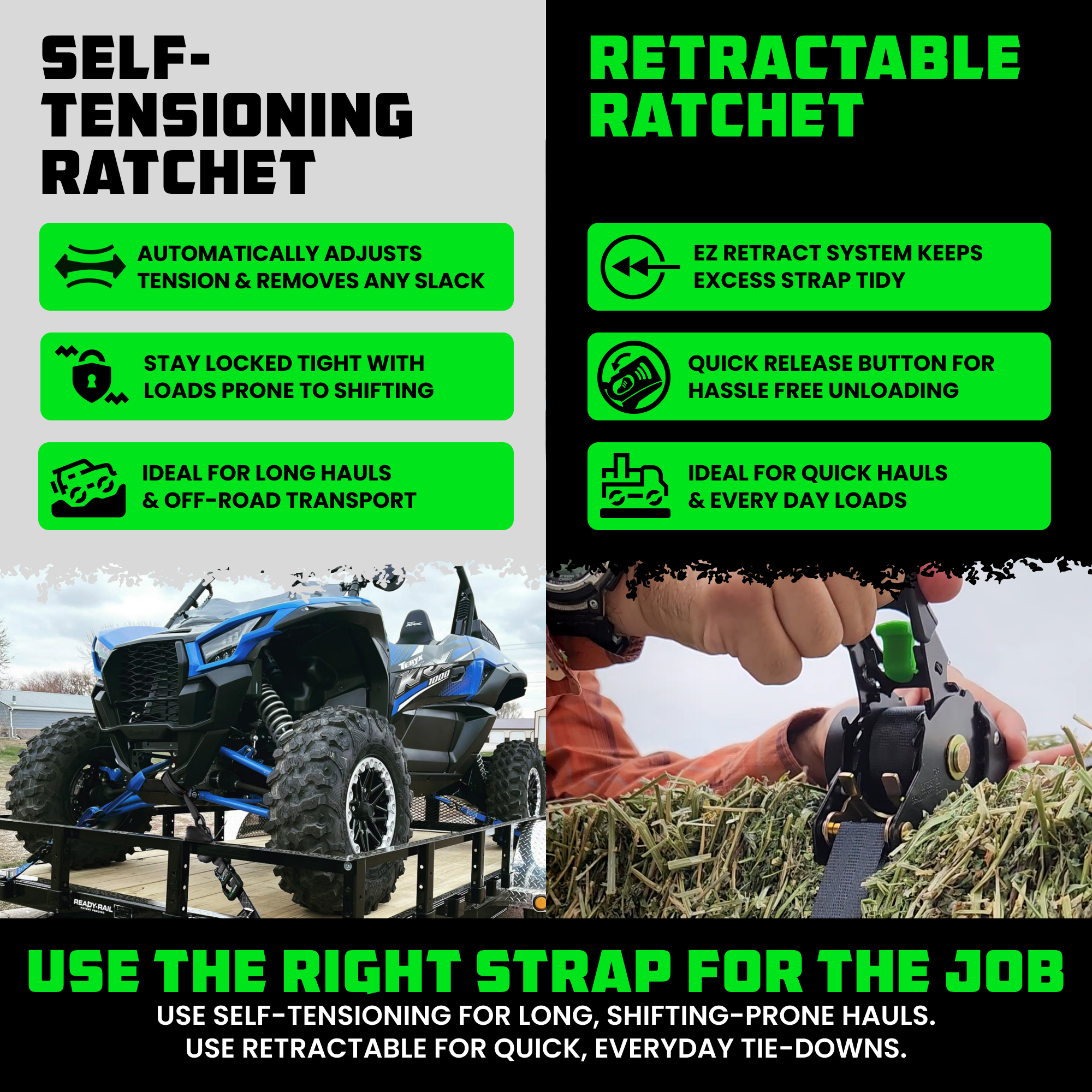 These break strengths are higher than industry standard for retractable ratchet straps.