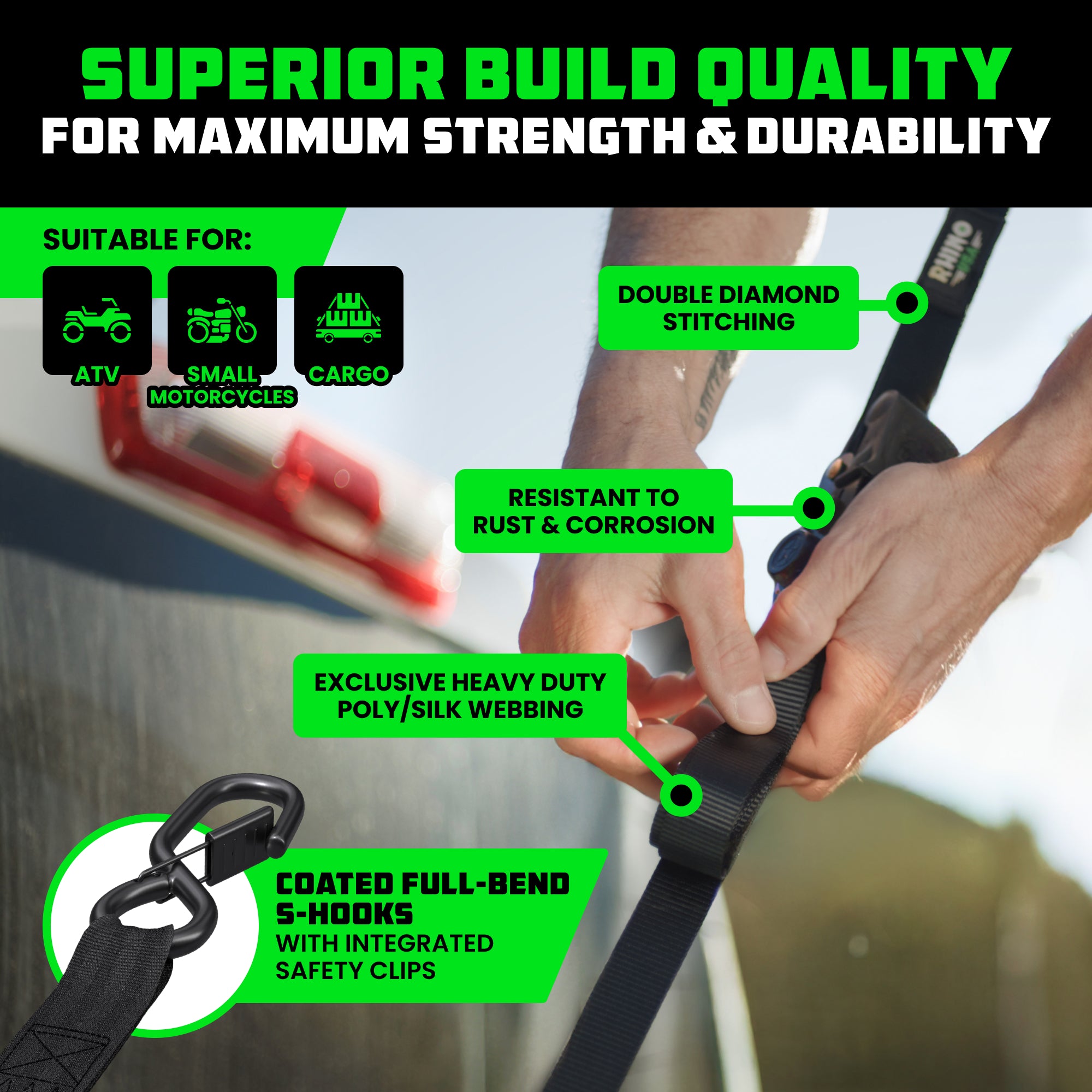 The Rhino USA retractable ratchet straps are made out of our exclusive poly-silk webbing with anodized ratchets, ergonomic padded handles, and coated full-bend s hooks.