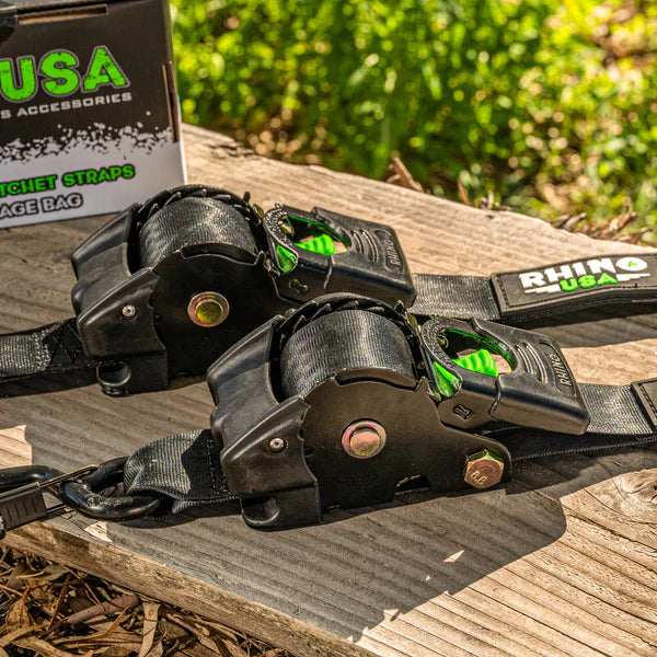The Rhino USA retractable ratchet straps are made out of our exclusive poly-silk webbing with anodized ratchets, ergonomic padded handles, and coated full-bend s hooks.