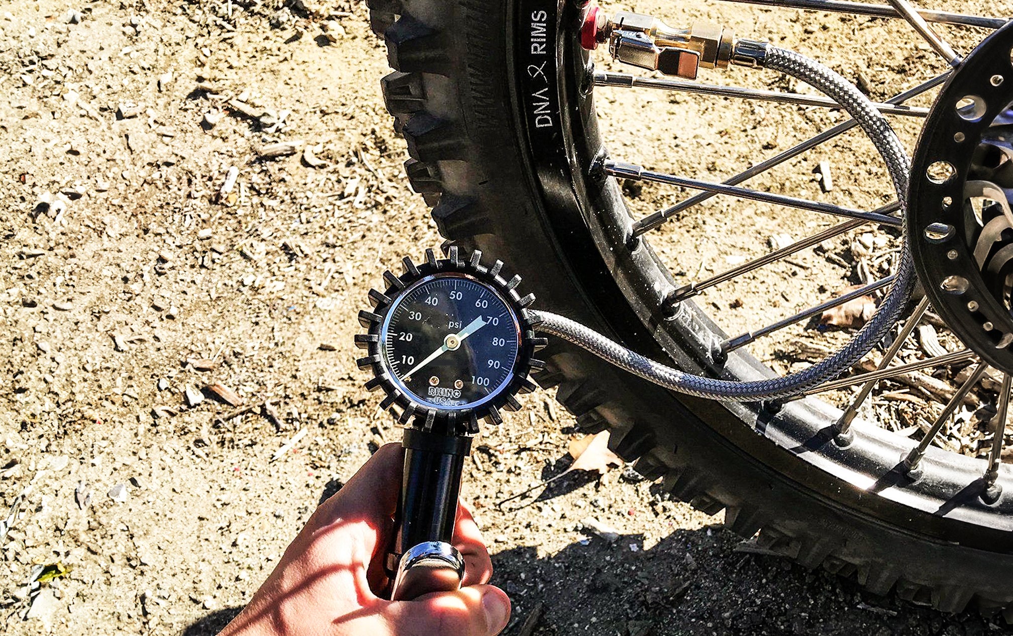 This tire inflator gauge is equipped with a versatile inflation trigger that allows for controlled and effortless inflation. Whether you need to inflate car tires, bike tires, sports equipment, or inflatable toys, this tool provides the versatility to handle various inflation needs with ease. The 100PSI Tire inflator gauge features interchangeable solid brass chucks, a durable “no leak” braided hose, and a rugged cover for maximum protection. This is a heavy duty tire inflator gauge, designed for long journeys on the road with a motorcycle, UTV, truck, or SUV.