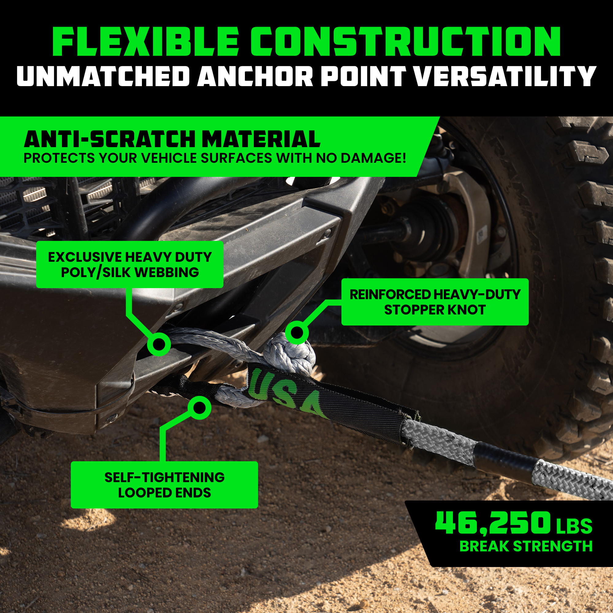Strong, safe, and made for serious rigs — these 1/2" Soft Shackles replace traditional steel D-rings with lightweight strength and unmatched versatility. Designed to handle the loads your one-ton truck demands, they connect effortlessly to your Kinetic Rope or Tow Points for a quick, secure recovery every time.