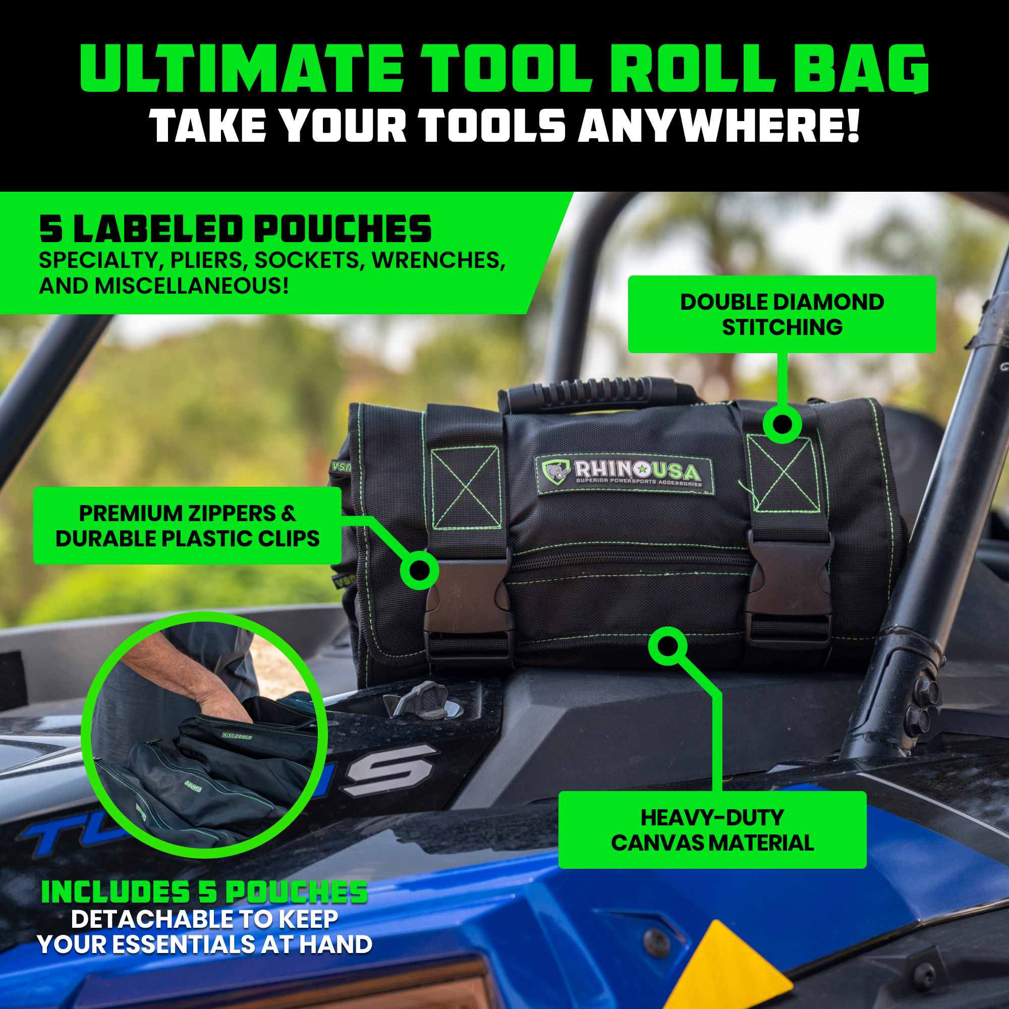 Stay prepared for mid-trail fixes with the Rhino USA Tool Roll — built with five labeled, removable pockets for easy organization. From tightening bolts to swapping belts, it keeps your essential tools neatly stored and ready to go. Combined with your recovery gear, it’s everything you need to keep your truck, UTV, etc. running strong deep in the back country.