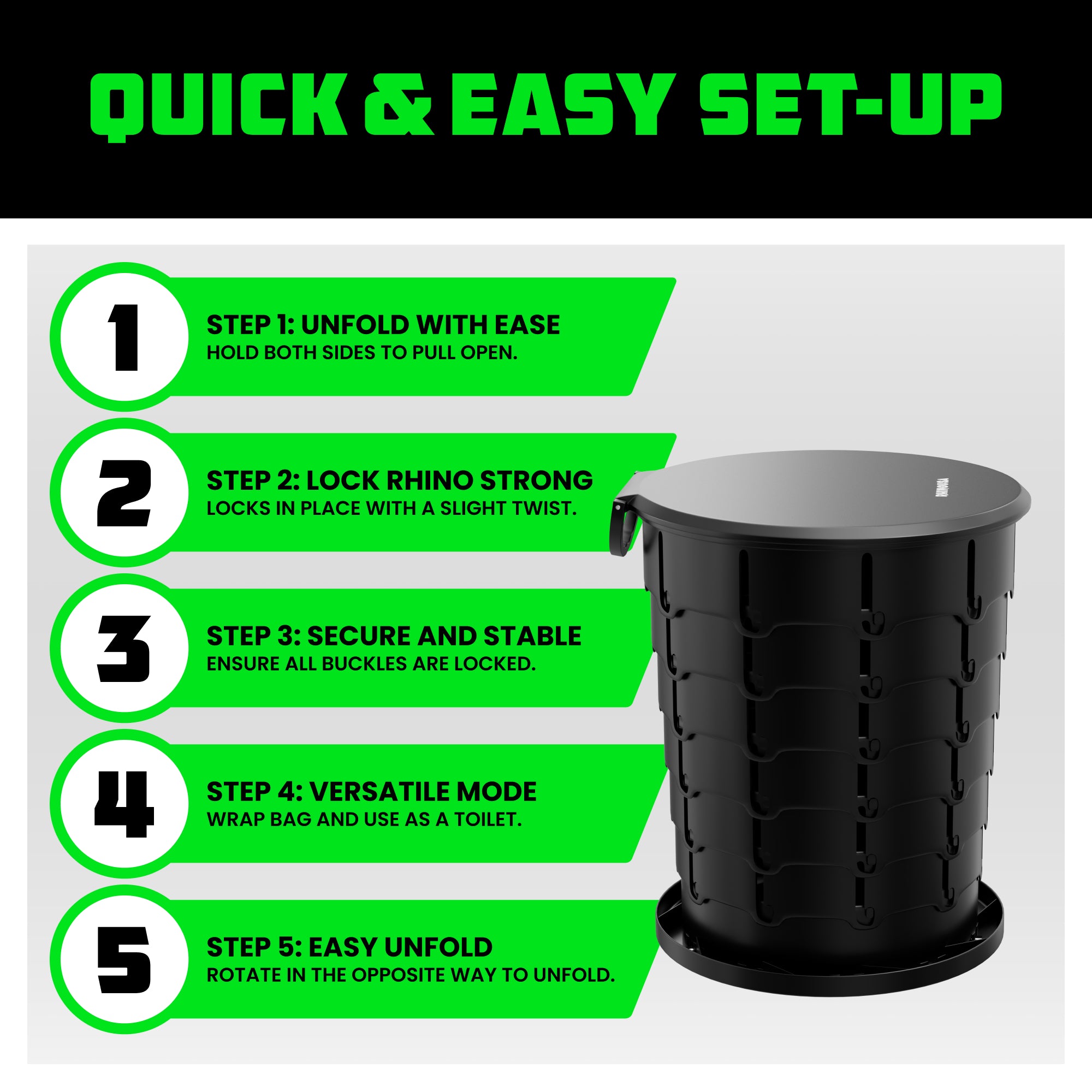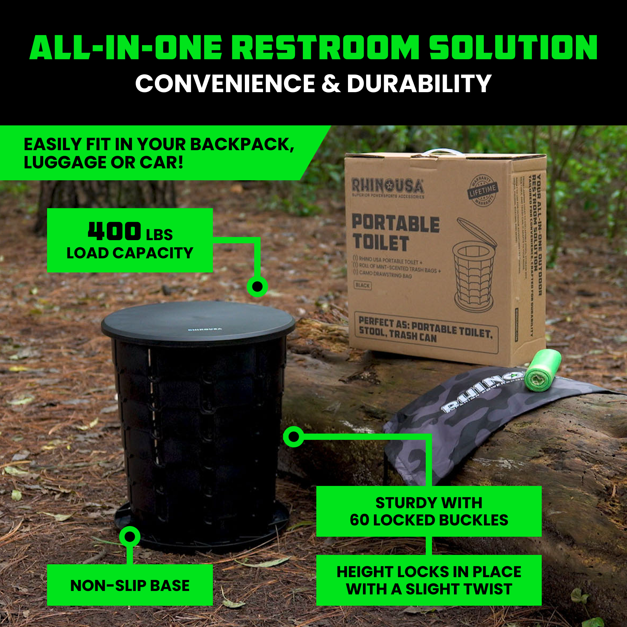 Built with 60 reinforced buckles and a non-slip base, this toilet delivers reliable stability on any terrain. Its rugged construction supports up to 400 lbs, giving adults and kids alike a secure and comfortable experience. Whether on rocky campsites, uneven trails, or boat decks, Rhino Tough strength ensures it’s ready for the outdoors.