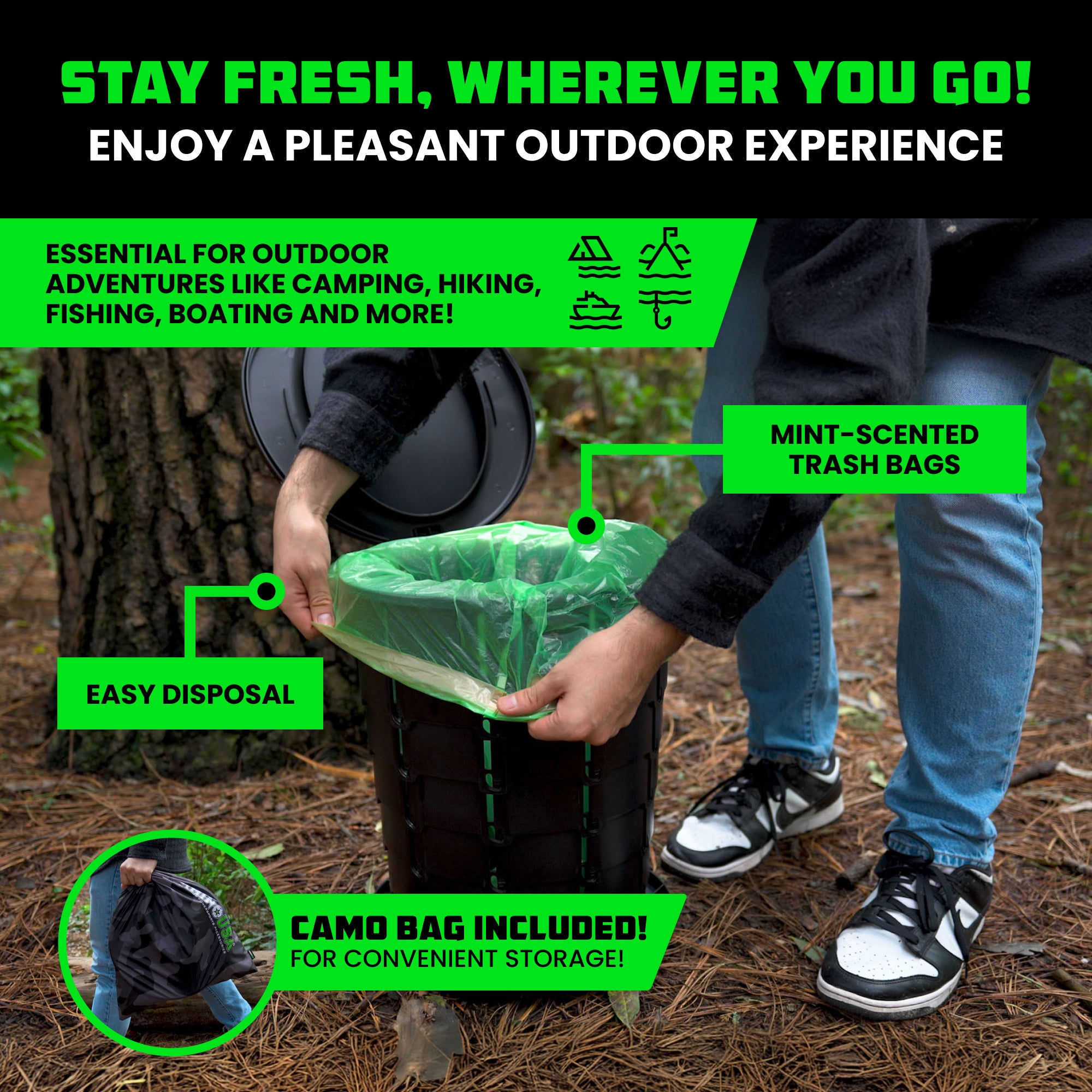 Weighing only 4 lbs, this lightweight design collapses flat for effortless transport and storage in a compact camo bag. Included mint-scented bags make waste disposal simple and odor-free! Whether camping, hiking, fishing, or road-tripping, this portable solution keeps your adventures fresh and stress-free.