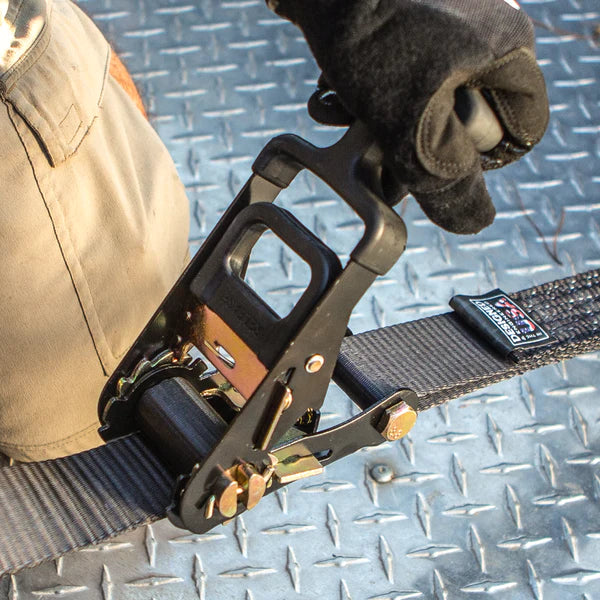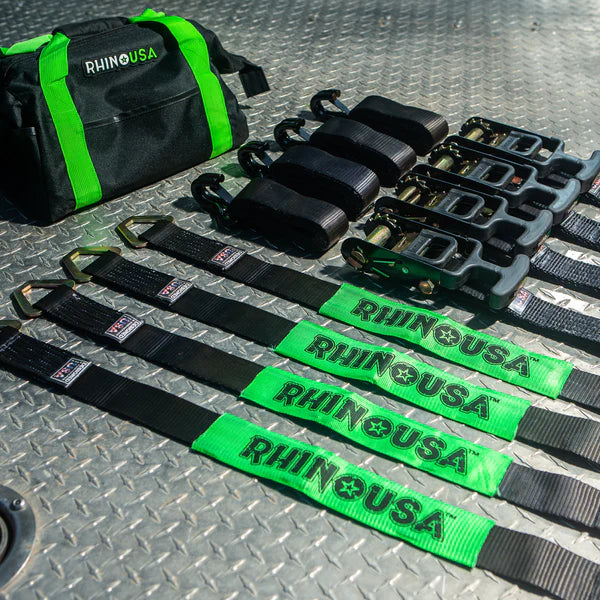 Our Heavy-Duty Vehicle Ratchet Tie-Down Kit is constructed with premium materials to ensure exceptional strength and durability. The heavy-duty ratchet mechanism and sturdy straps are designed to handle the toughest loads, providing maximum security during transport. Our straps are guaranteed to have a maximum break strength of 11,128 lbs, made with our patented T-handle ratchets, chromoly J-hooks, and our exclusive Rhino USA poly blend webbing.