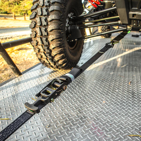 The adjustable straps allow you to customize the length and tension to suit different load sizes and shapes. Whether you're securing motorcycles, ATVs, SUV’s, or other heavy items, these vehicle tie downs provide a flexible and adaptable solution. Our high load capacity ratchet tie downs offer a secure and reliable hold for your valuable cargo. The strong hooks firmly anchor the tie downs to anchor points, preventing any movement or shifting, even on rough terrains. You can trust that your cargo will stay in place throughout the journey.