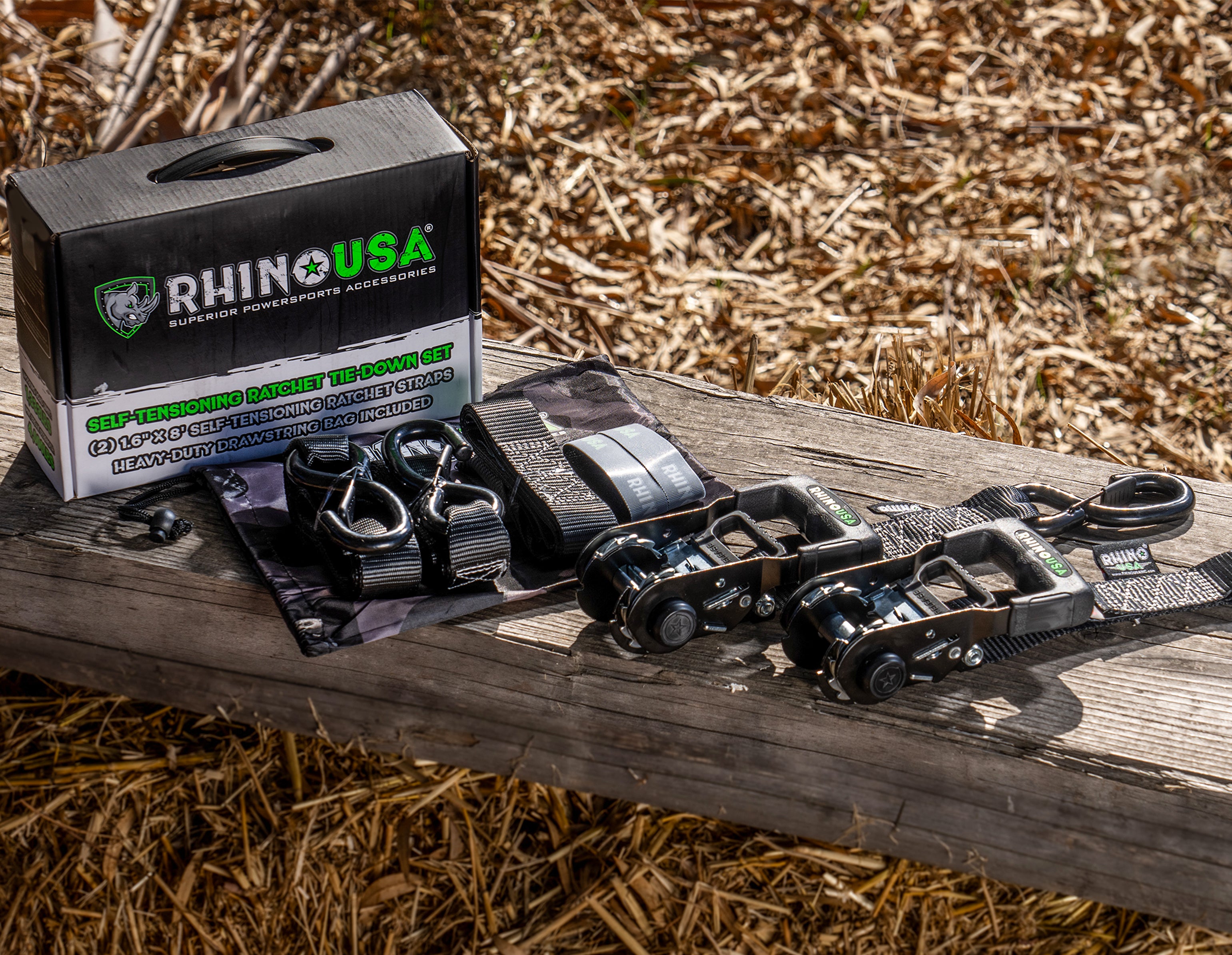 Rhino USA Self-Tensioning Ratchet Straps boast an impressive 1,333lbs working load limit and 4,000lbs break strength, providing robust durability for heavy loads and tough conditions.