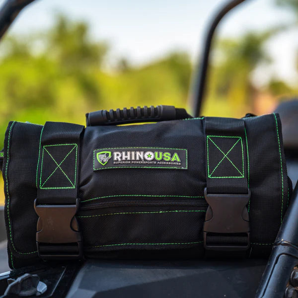 The Rhino USA UTV Tool Organizer Roll Bag offers spacious storage capacity with multiple large pockets and compartments. It is designed to keep your tools, accessories, and small equipment organized and easily accessible.