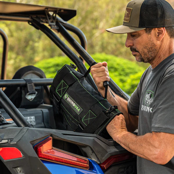 The Rhino USA UTV Tool Organizer Roll Bag offers effortless portability for your tools. The roll-up design allows for compact and space-saving storage, making it easy to transport the bag between your UTV and other locations. The bag also features an adjustable shoulder strap, and comfortable carrying handle, enabling you to carry it with ease. Whether you need to move your tools from one UTV to another or take them to a worksite, the convenient portability of this tool roll bag ensures hassle-free transportation and convenience.