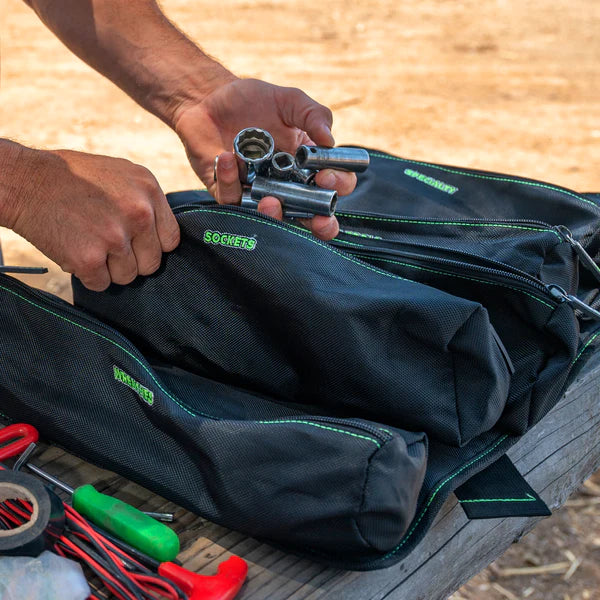 The various compartments allow you to separate and categorize your items, ensuring efficient organization on your UTV adventures. Our UTV tool roll bag is designed with large velcro pouches which are labeled and can easily be removed so you can avoid lugging a heavy toolbox around.